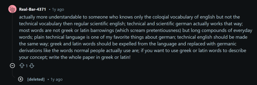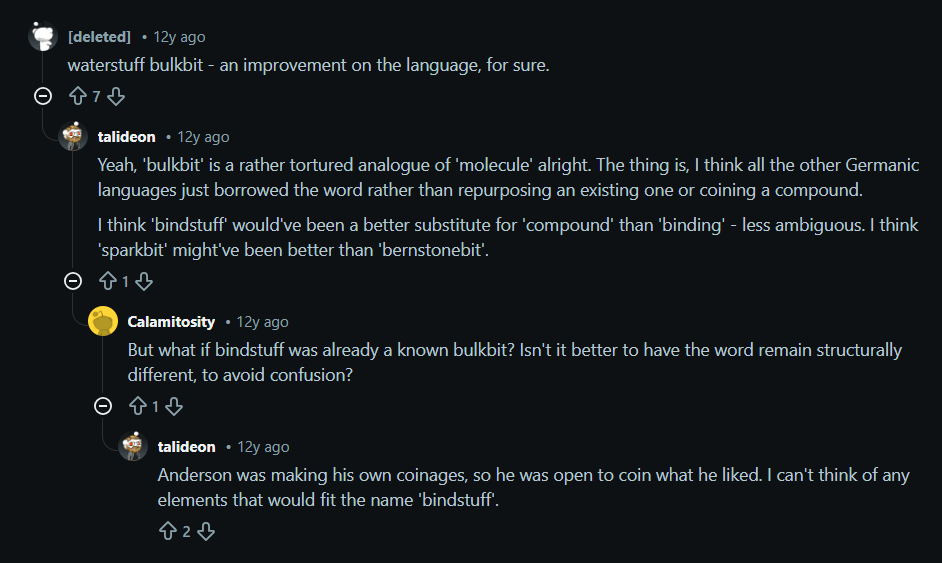 As you might already know, much of scientific language is based on Latin & Greek. So if you were to write an essay about atomic theory in Anglish, you would need to invent many words. That is what Anderson’s essay does. It takes away all Latin & Greek and replaces it with new, made up termnology. Thats why I desrcibed it as “What Atomic Theory sounds like to Aliens”. Because as you read it, it won’t sound like the science your used to. Instead you will feel as though you are reading about the technicalities behind a magic system written in the language of a fantasy world.